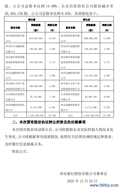 12月24日金融一线音讯,西安银行公告称,近日,西安银行股份有限公司(以下简称“公司”)收到鼓舞西安投资控股有限公司(以下简称“西投控股”)和长安海外相信股份有限公司(以下简称“长安相信”)的奉告。为了促进国有鼓舞资源整合,进步国有金融本钱运营处置效果,长安相信拟将其执有公司的48,268,809 股,占公司总股本 1.08%的股份,以条约转让样式转让至西投控股执有。